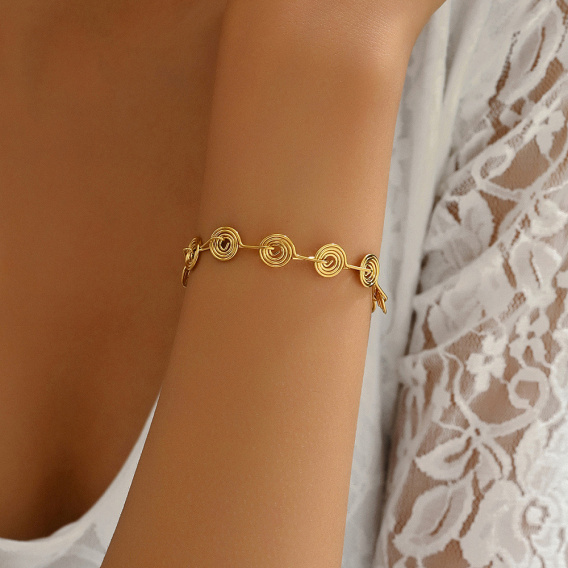 Ta pozłacana 18-karatowym złotem retro i wszechstronna damska bransoletka jest idealna zarówno do pracy, jak i na wakacje. Kolor jest złoty, a styl to mieszanka mody, casualu, romantyzmu, elegancji, retro i minimalizmu. Projekt charakteryzuje się geometrycznymi wzorami i złoceniem, dzięki czemu wyróżnia się. Wykonana ze stali szlachetnej bransoletka nadaje się do codziennego noszenia, na imprezy, święta, ulice i nieformalne wyjścia. Jest to bransoletka łańcuszkowa o wadze 8 gramów, a materiał łańcuszka to stal. Dodaj odrobinę wyrafinowania i stylu do swojego stroju dzięki temu wyjątkowemu i modnemu elementowi biżuterii.