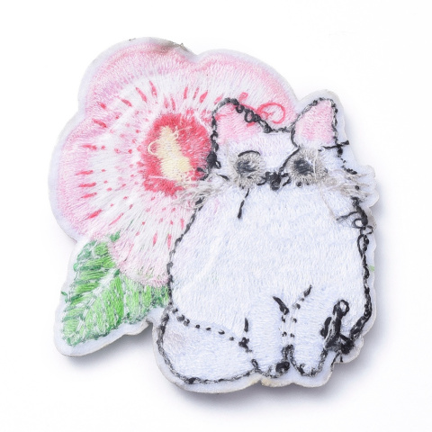 Naszywka biały kot z kwiatem 58x52mm